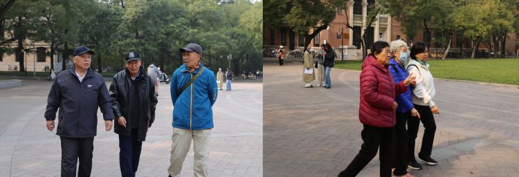 秋阳和煦,老同志们信步校园,穿梭于银杏大道与古典建筑之间。大家三五成群,边走边聊,不时驻足留影,重温青春记忆,交流退休生活,畅谈时代变迁,气氛温馨而融洽。