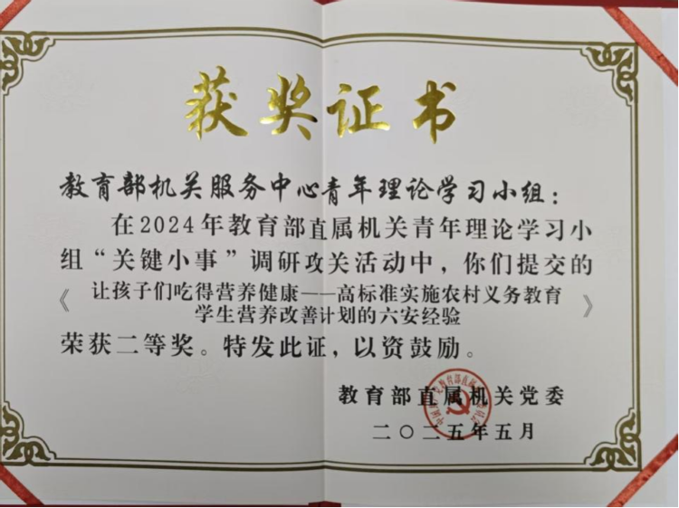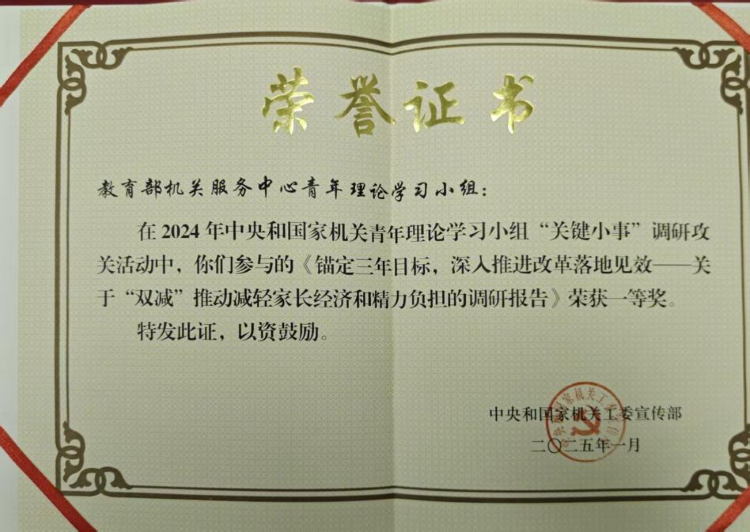 中心青年理论学习小组参与的《锚定三年目标,深人推进改革落地见效——关于“双减”推动减轻家长经济和精力负担的调研报告》在2024年中央和国家机关青年理论学习小组“关键小事”调研攻关活动中荣获一等奖;《让孩子们吃得营养健康——高标准实施农村义务教育学生营养改善计划的六安经验》调研报告在2024年教育部直属机关青年理论学习小组“关键小事”调研攻关活动中荣获二等奖。中心原青年理论学习第二小组获评教育部直属机关青年理论学习示范小组。